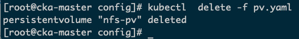 | `配置说明`: capacity 指定 PV 的容量为 1G。 accessModes 指定访问模式为 ReadWriteOnce,支持的访问模式有: ReadWriteOnce – PV 能以 read-write 模式 mount 到单个节点。 ReadOnlyMany – PV 能以 read-only 模式 mount 到多个节点。 ReadWriteMany – PV 能以 read-write 模式 mount 到多个节点。 persistentVolumeReclaimPolicy 指定当 PV 的回收策略为 Recycle,支持的策略有: Retain – 需要管理员手工回收。 Recycle – 清除 PV 中的数据,效果相当于执行 rm -rf /thevolume/*。 Delete – 删除 Storage Provider 上的对应存储资源,例如 AWS EBS、GCE PD、Azure Disk、OpenStack Cinder Volume 等。 storageClassName 指定 PV 的 class 为 nfs。相当于为 PV 设置了一个分类,PVC 可以指定 class 申请相应 class 的 PV。 指定 PV 在 NFS 服务器上对应的目录。